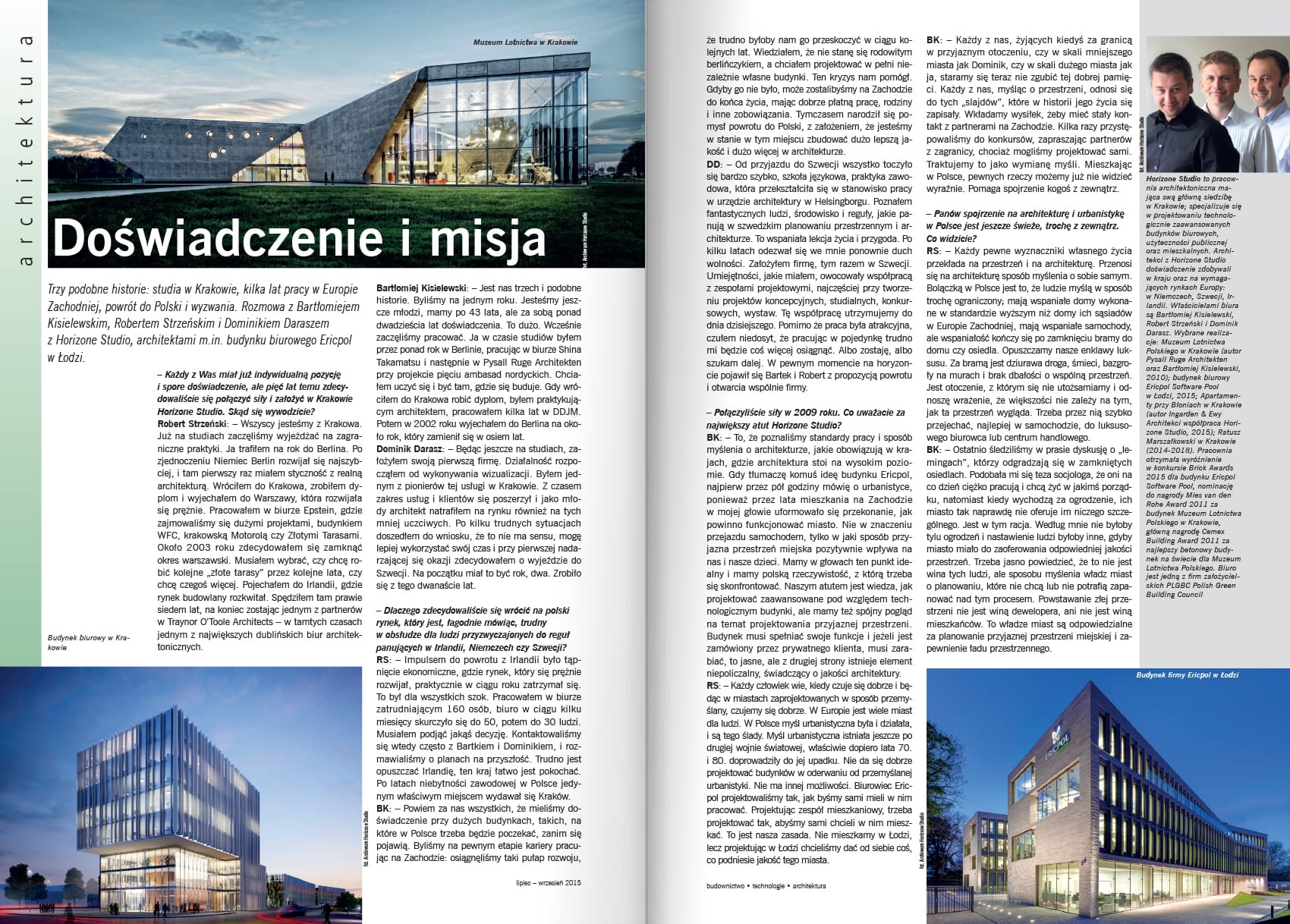 “…Three similar stories: studies in Krakow, several years of work in Western Europe, return to Poland and challenges. A conversation with Bartłomiej Kisielewski, Robert Strzeński and Dominik Darasz of Horizone Studio, architects of, among others, the Ericpol office building in Lodz…”