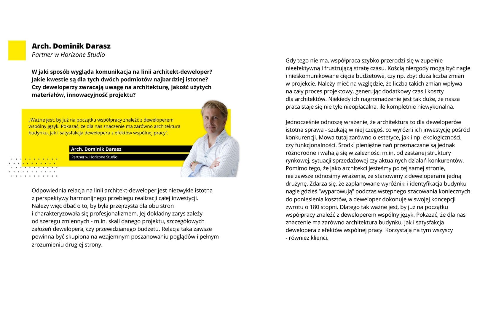 At the same time, I get the impression that architecture is an important issue for developers – they are looking for something in it that will make their investment stand out among the competition. We are talking about aesthetics, as well as, for example, environmental friendliness or functionality. However, the money spent on it varies and fluctuates depending on, among other things, the existing market structure, the sales situation or the current activities of competitors. Despite the fact that as architects we are on the same side, we don’t always get the impression that we are one team with developers. It happens that the planned differentiators and identification of the building suddenly “evaporate” somewhere during the initial estimation of the necessary costs to be incurred, and the developer makes a 180-degree turn in his concept. That is why it is so important to find a common language with the developer at the beginning of cooperation. Show that what matters to us is both the architecture of the building and the developer’s satisfaction with the results of joint work. This benefits everyone – including customers.