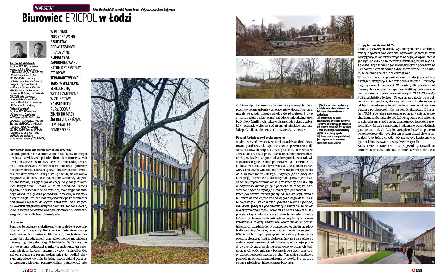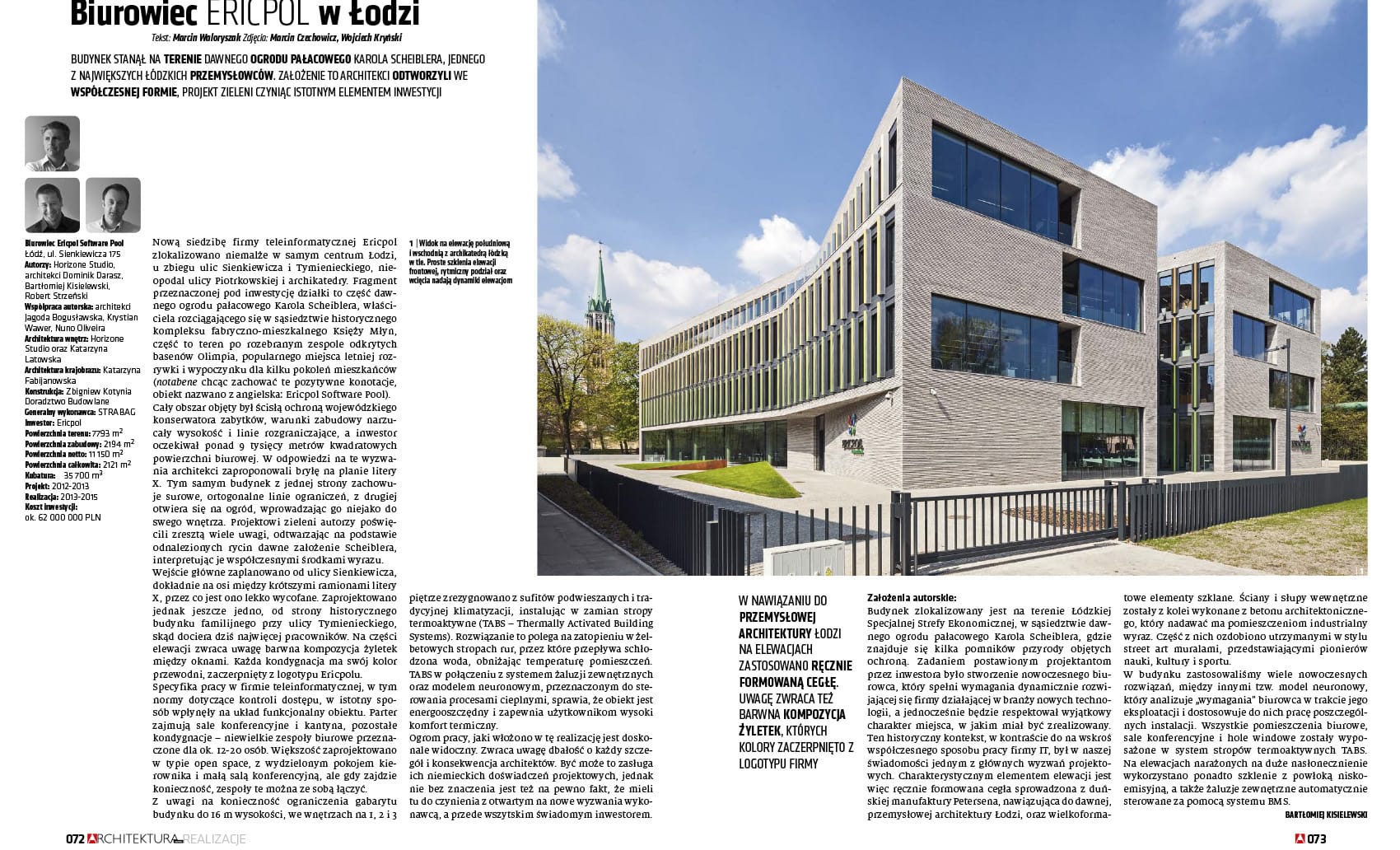Another publication about the Ericpol office building in Lodz in the latest August issue of Architektura-Murator monthly. In the article you can read a statement by Bartłomiej Kisielewski, partner of Horizone Studio office, who talks about the author’s assumptions and the whole project.