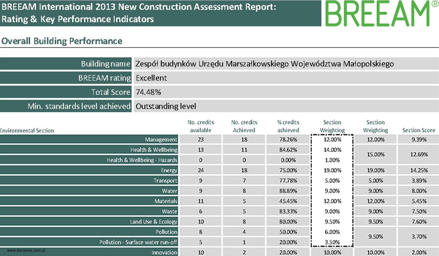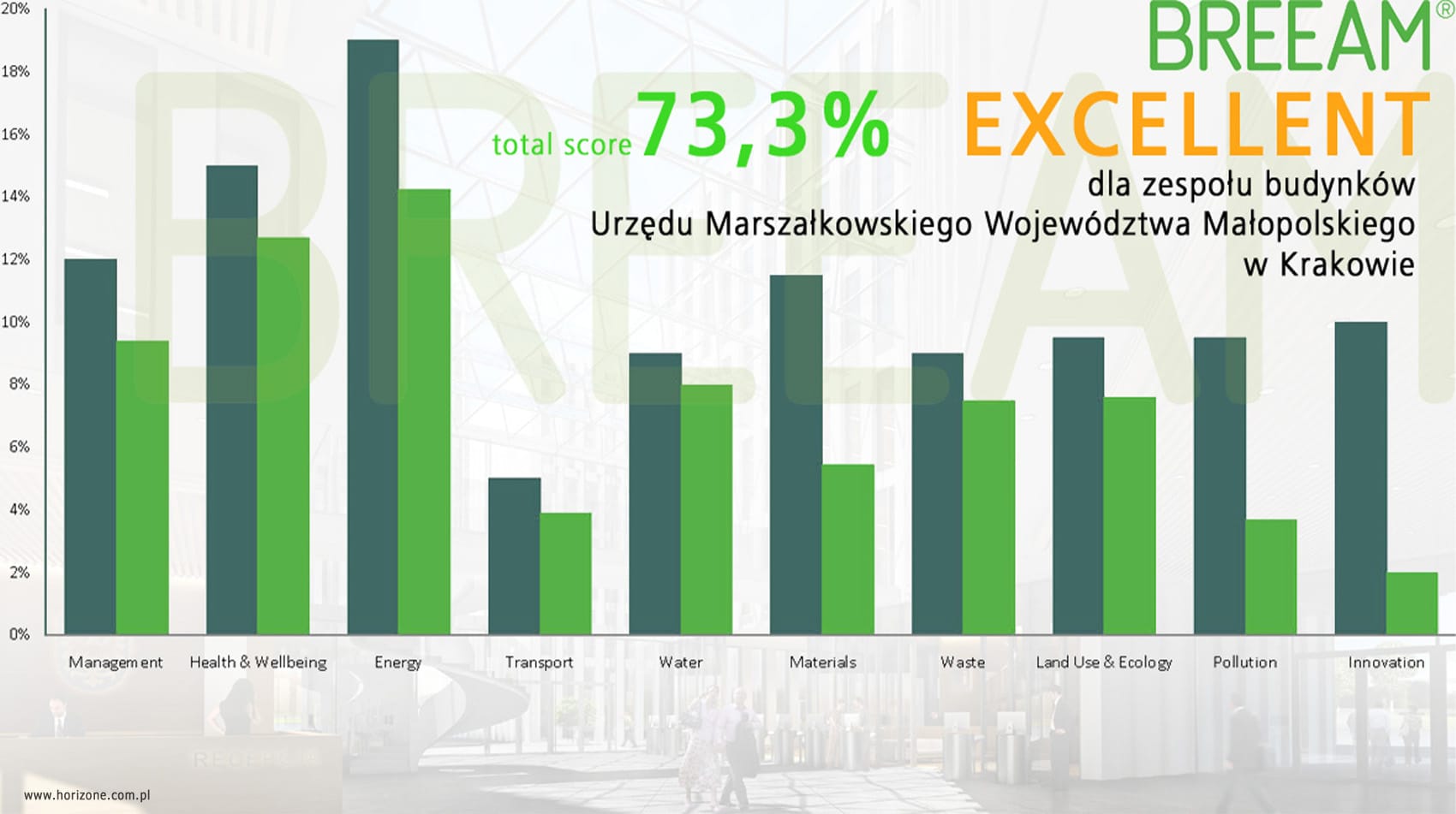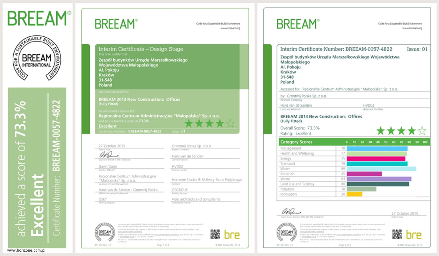 On 27.10.2015. BRE (Building Research Establishment), based in London, after evaluating the report on the multi-criteria environmental assessment of the project of the buildings of the Marshal’s City Hall in Krakow, issued a BREEAM Interim EXCELLENT certificate. The project ultimately received 73.3% of the points, resulting in an Excellent rating.