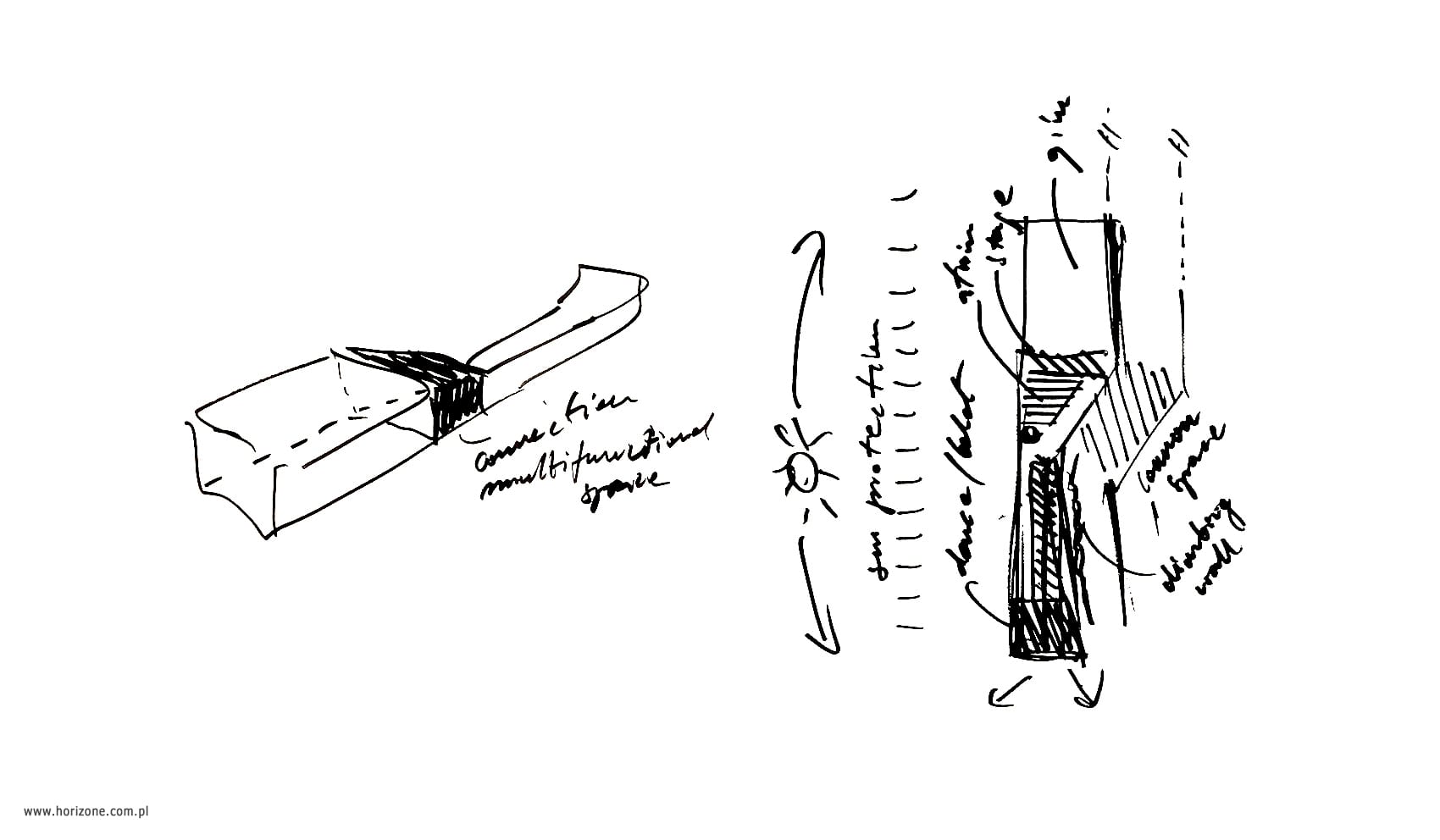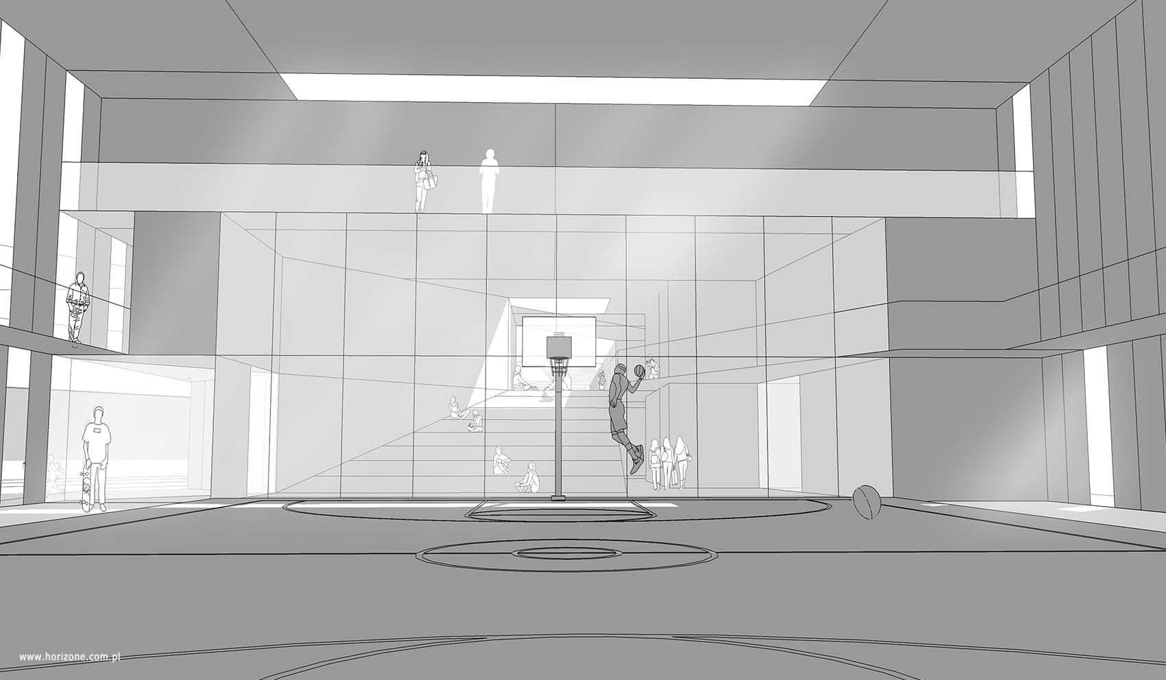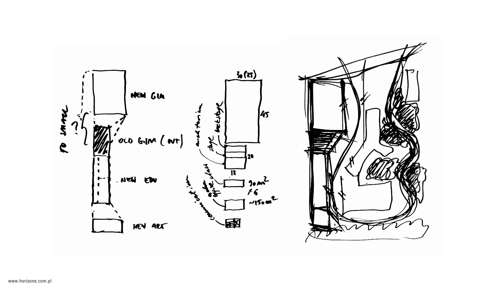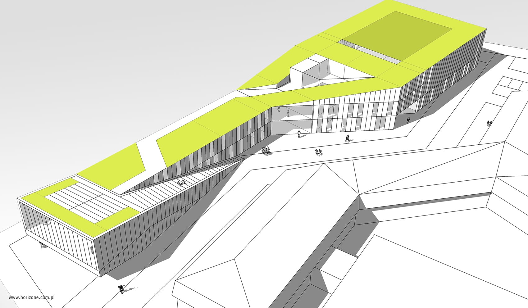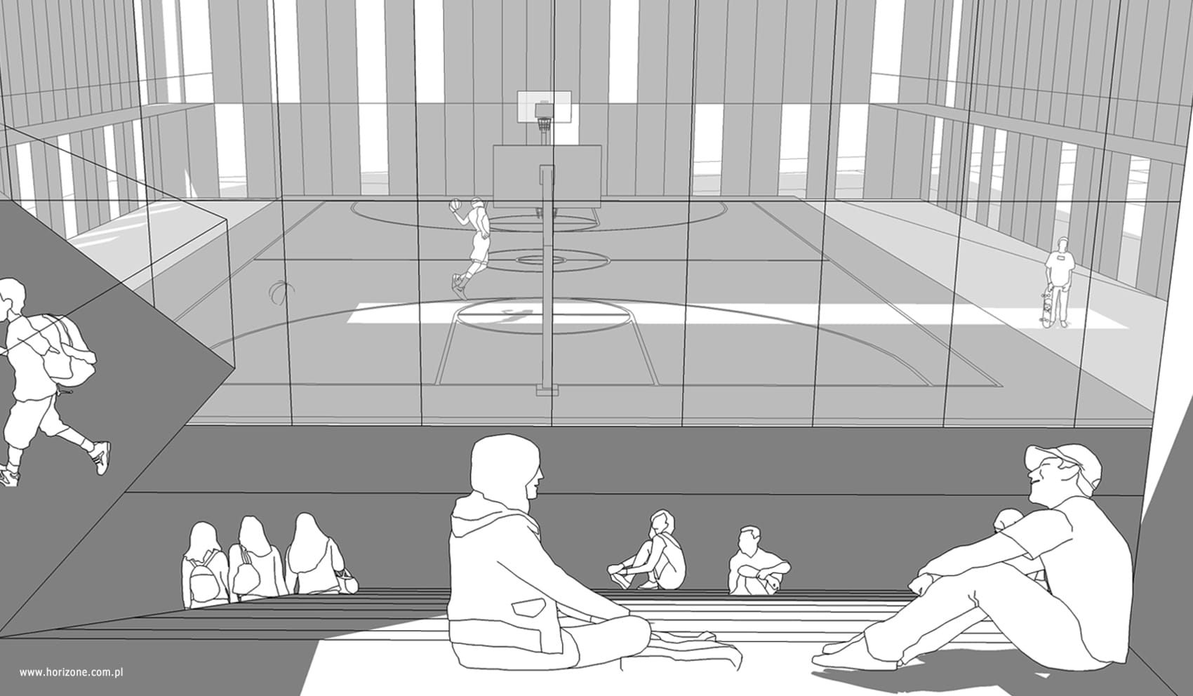 The facility would include classrooms, as well as sports, gymnastics and ballet rooms. The facility would be closely linked to the functions located in the existing school buildings. The premise of the project was to create a modern educational space that is inclusive and inspiring. That’s why some rooms are visually interconnected. The building received a public green roof, where recreational elements were placed. As in every Horizone project, natural light penetrating into the interiors was to play an important role.
