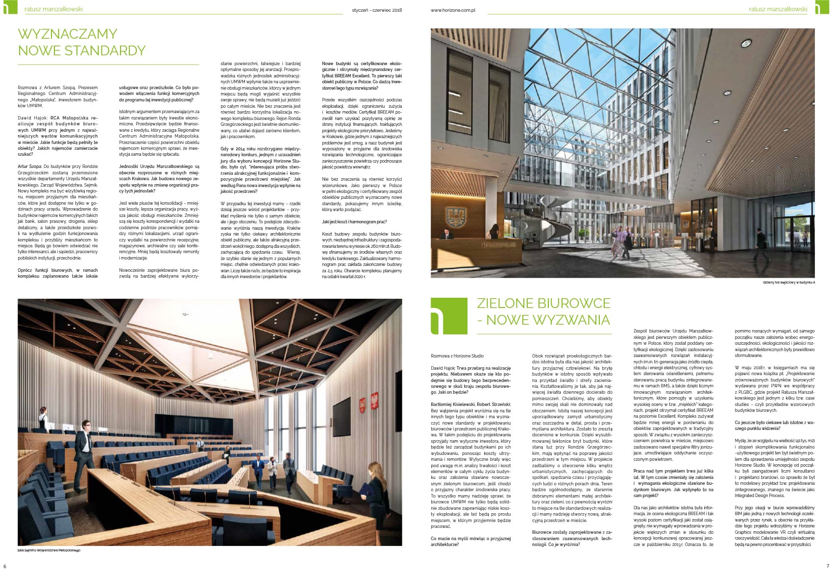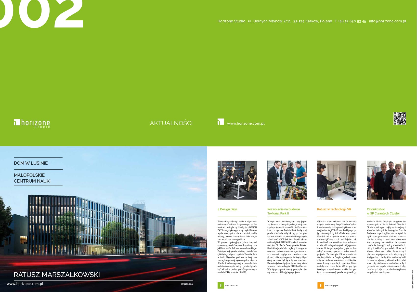 This time the main topic is the project of the Marshal’s City Hall in Krakow. The center of Krakow will be home to the first fully ecological and certified complex of public facilities. The city will also gain an attractive public space with carefully selected elements of small architecture and greenery. The new complex is expected to be a showcase for the region, setting standards in the design of office buildings and public spaces. We also show our idea for the Malopolska Science Center and a single-family house located in a picturesque village near Krakow. Meanwhile, the Horizone Graphics mock-up studio presents its latest works and argues that mock-ups are the future of cities. The newsletter will be available by mail or directly from the Horizone Studio office. We hope that it will soon reach your hands as well.