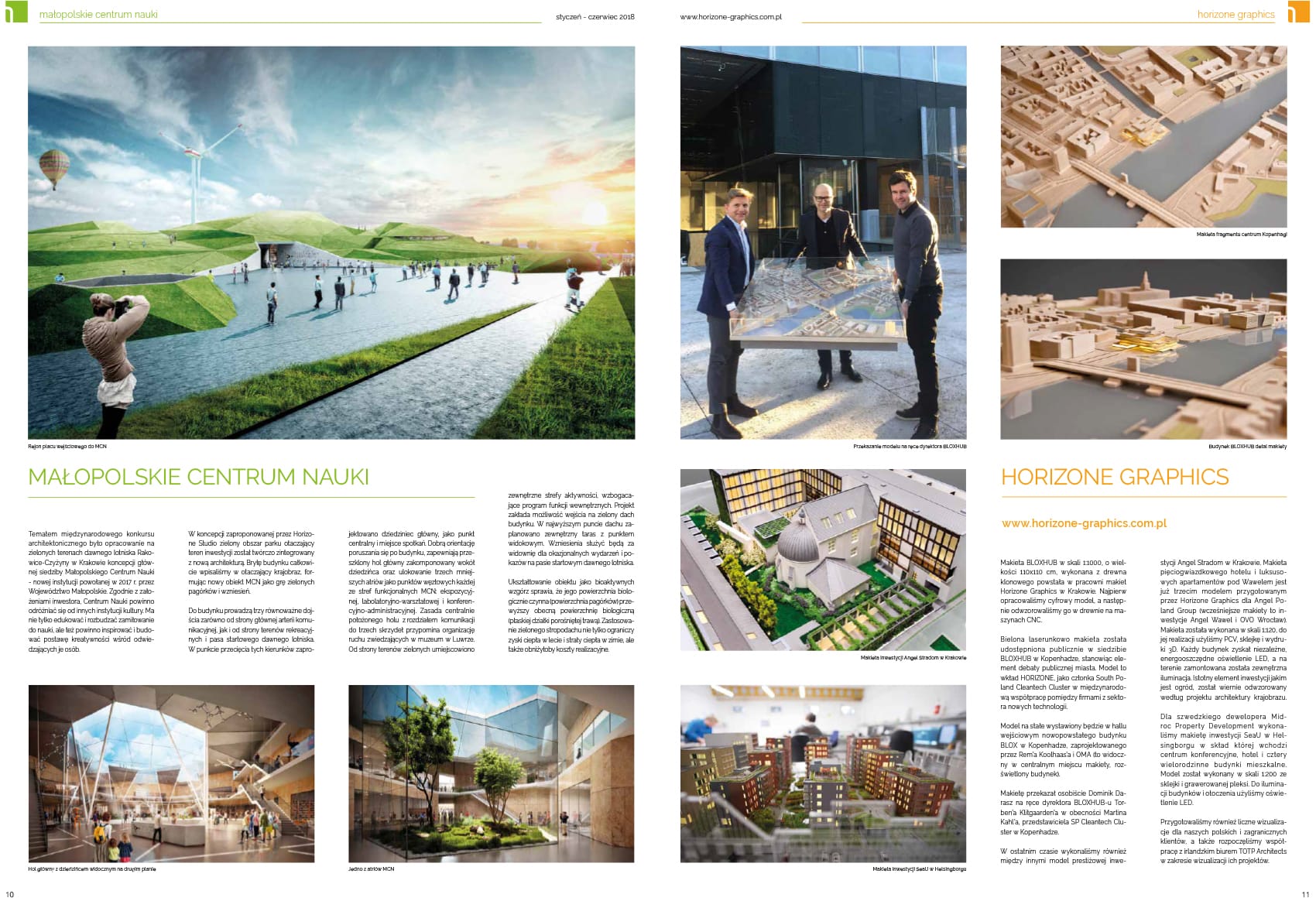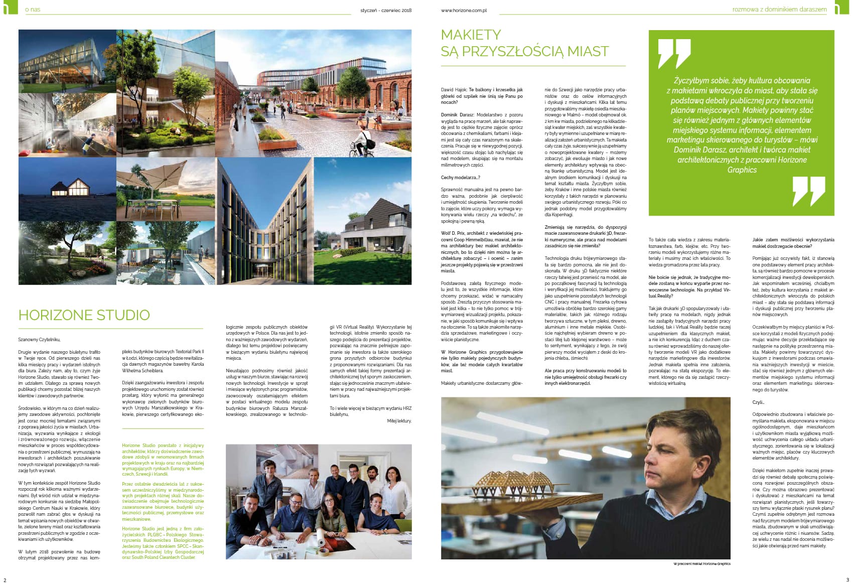 On page 2 you can read at a glance what interesting things have happened in our office recently. And on page 3 you will find an interesting conversation about how architectural models and mock-ups can help in the discussion of urban planning and the specifics of the work of model makers. On pages 8-9, we presented our recently completed single-family house in Lusina, near Krakow. And on pages 10 and 11, you can see our competition entry for the Malopolska Science Center and read news about Horizone Graphics.