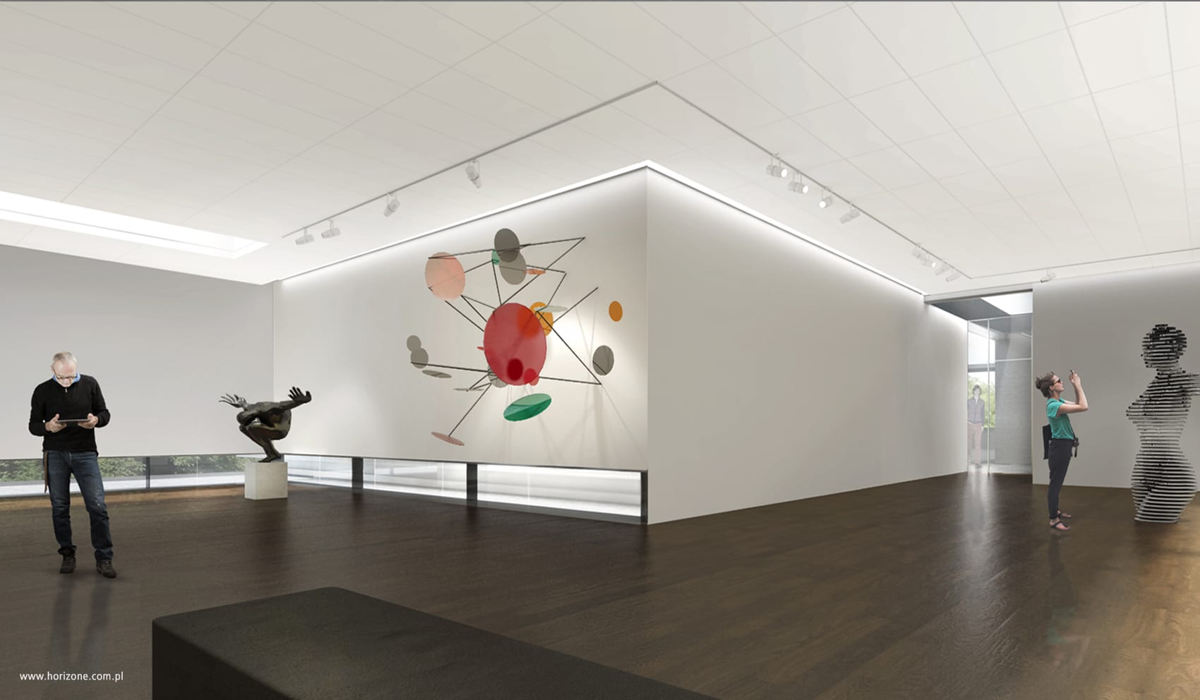 The facade of the superstructure and the full terrace balustrades were moved from the attic so that the existing gallery building with its concrete facade was visible from the street. Low lighting on the floor and skylights on the roof create an intimate atmosphere within the interior. The terrace is intended to be a multifunctional space used for outdoor exhibitions, educational meetings, vernissages and to extend the exhibition functions of the interior.