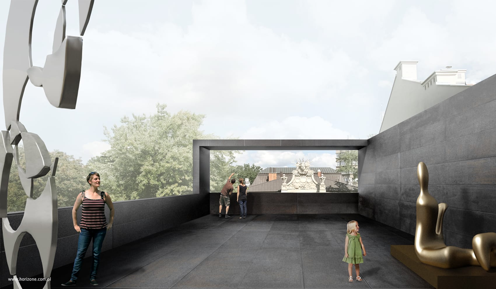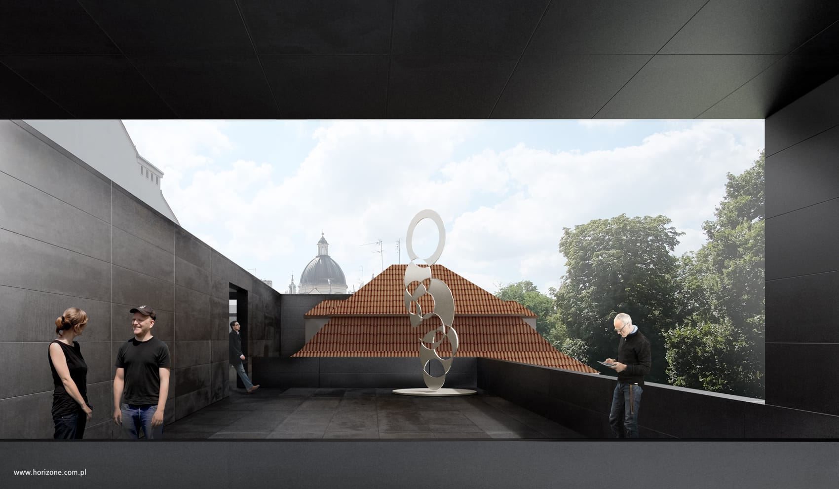 The building’s superstructure was given an unusual character. The idea of the superstructure is to add a new element to the existing structure – a volume structure integrated with an external terrace. The terrace has one wall, which serves as a background for the exhibition and separates it from the neighboring buildings. All elements placed on the roof constitute an optical unity – they are held together by the same material and color. Both the walls, the floor, the balustrades and other external elements are designed with matte black panels.