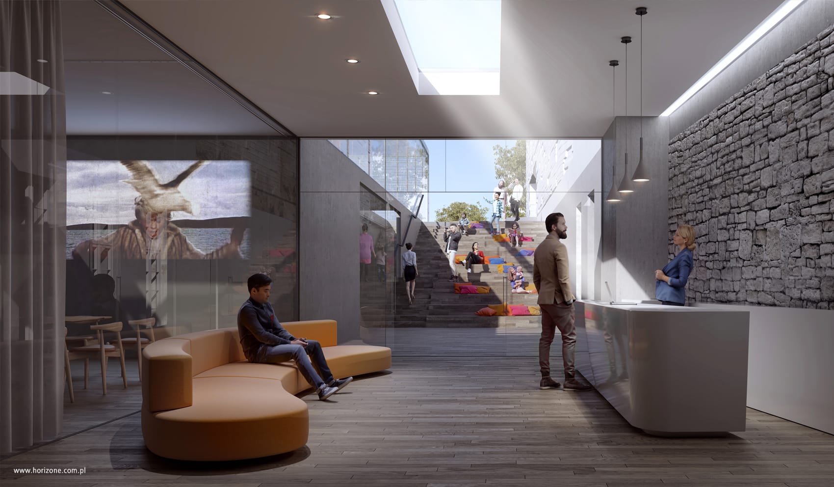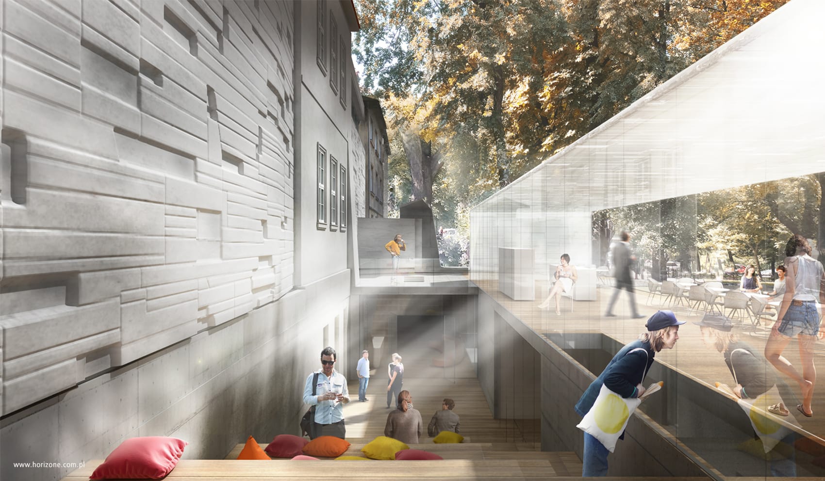 An important part of the underground extension is the external staircase leading from the square in front of the building on Szczepańska Street to the basement level, where a library, bookstore and conference room are located.