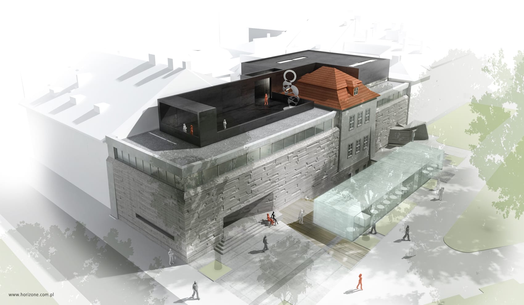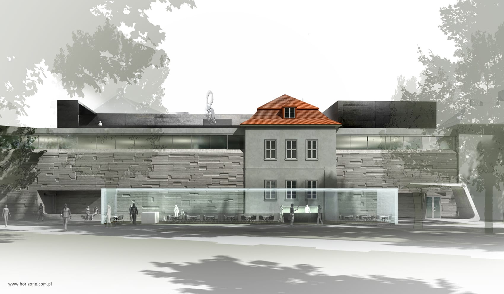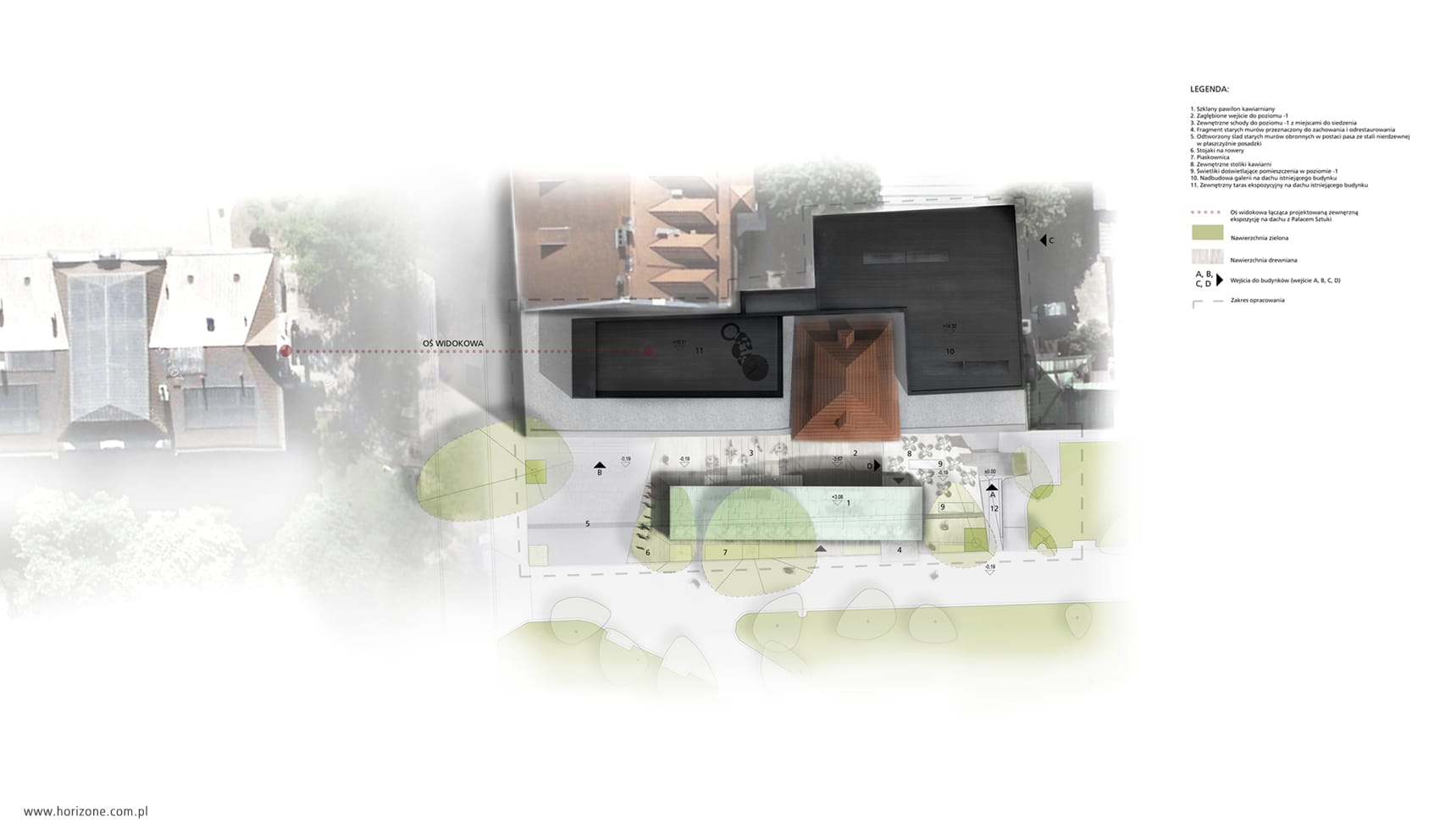 The investor planned to rearrange and restore elements of the original appearance of the existing gallery interiors which was completed in the 1960s, including the expansion of the underground part. Additionally, the main task of the competition was to come up with a concept for the extension of the “Bunker Sztuki” with additional exhibition space and a new pavilion for the currently existing café.