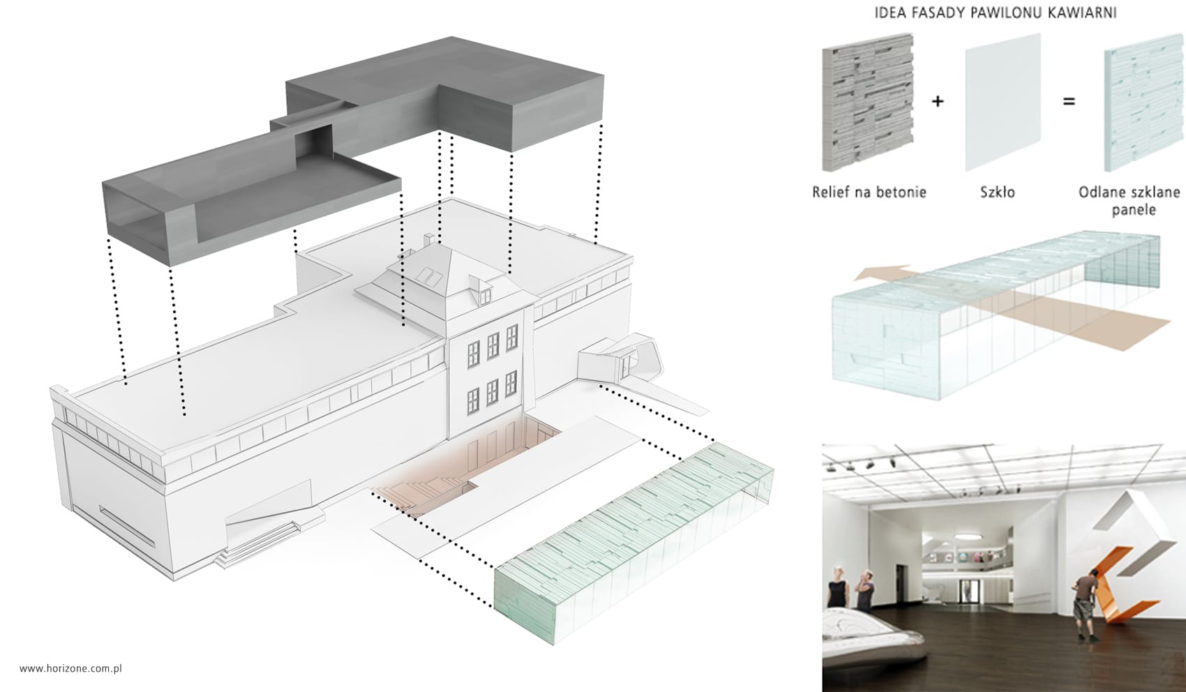 Within the project, we focused on three main design issues: reconstruction of the internal functional layout, expansion of the underground part of the building that includes a new café pavilion and the superstructure with additional exhibition spaces, which the investor plans to implement in the second stage.