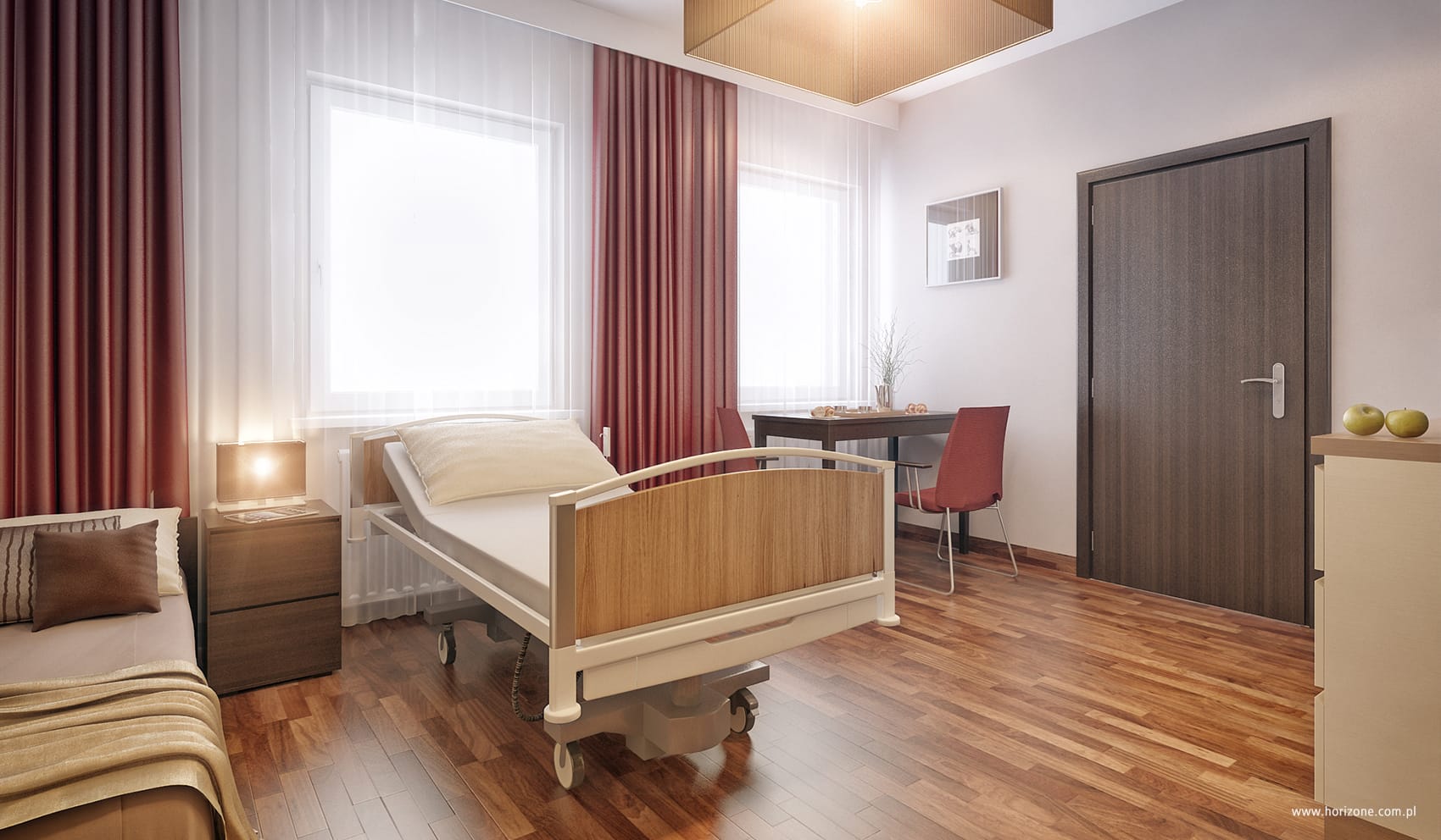 The new part of the building houses modern rehabilitation rooms on the first floor and hotel rooms with bathrooms on the other two floors. The subdued color scheme of the interiors is intended to provide comfort and relaxation for patients staying in the building, and to give the interiors an air of intimacy.