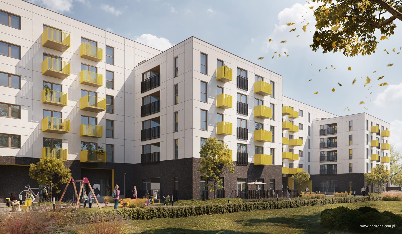 The narrower parts of this facade were withdrawn by 1.5 m in relation to the main body and accentuated with graphite and yellow siding, creating a repeating rhythm. The corner element of the building, which constitutes a dominant feature at the junction of Dębowa and Senatorska streets, was treated differently – its facades were finished with clinker tiles in a color referring to the historic factory buildings in Łódź.