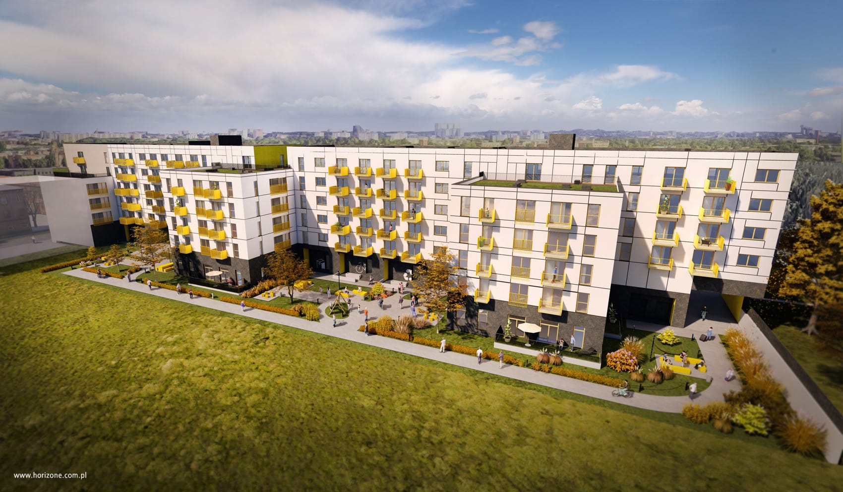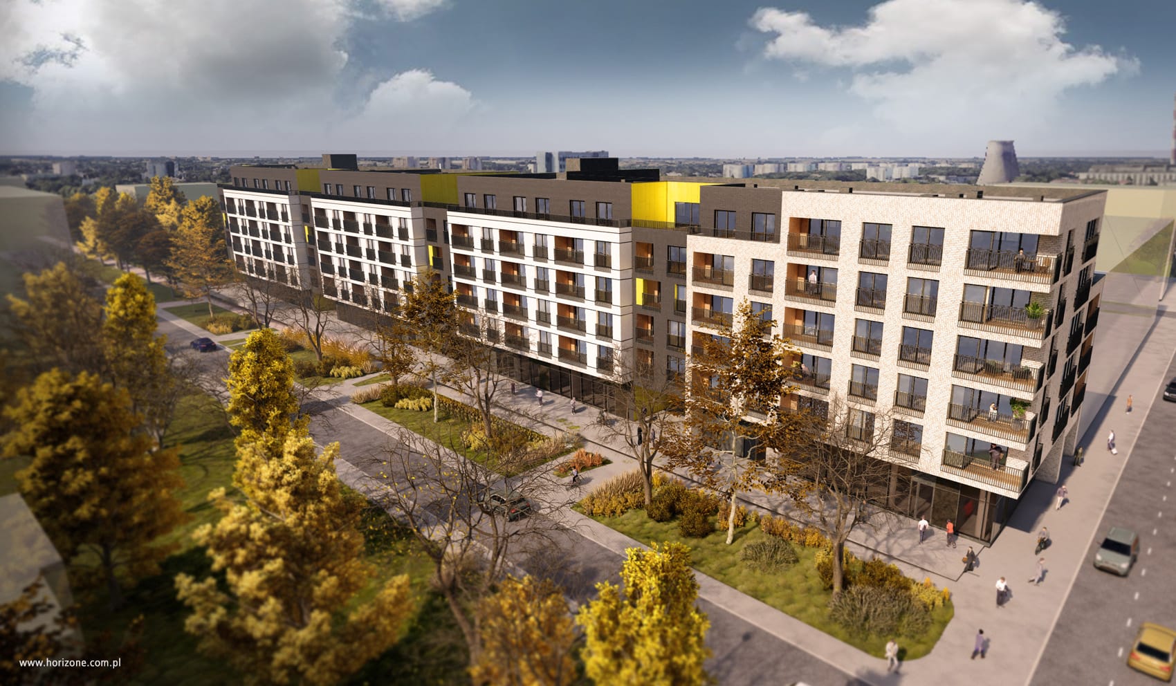 The investment area is located on its longer side along Dębowa Street. Due to the length of the facade, it was divided into smaller segments, so that their width resembles the typical width of tenement houses in the inner city of Łódź.