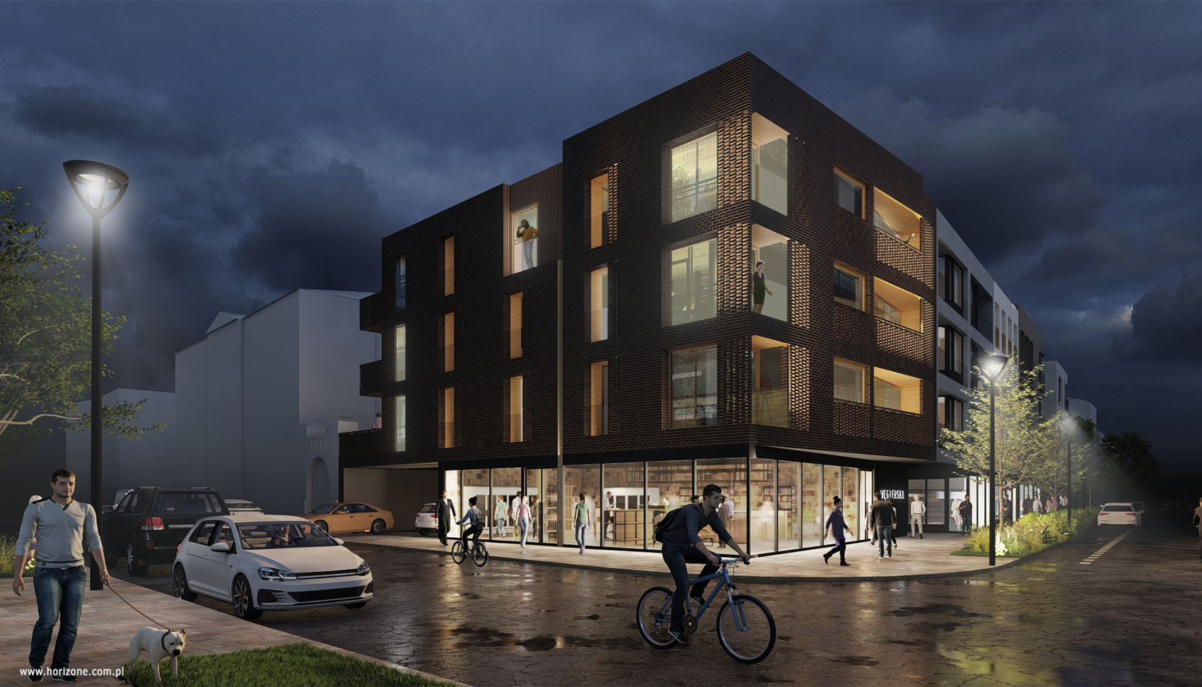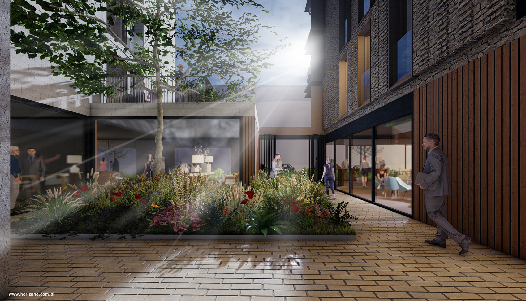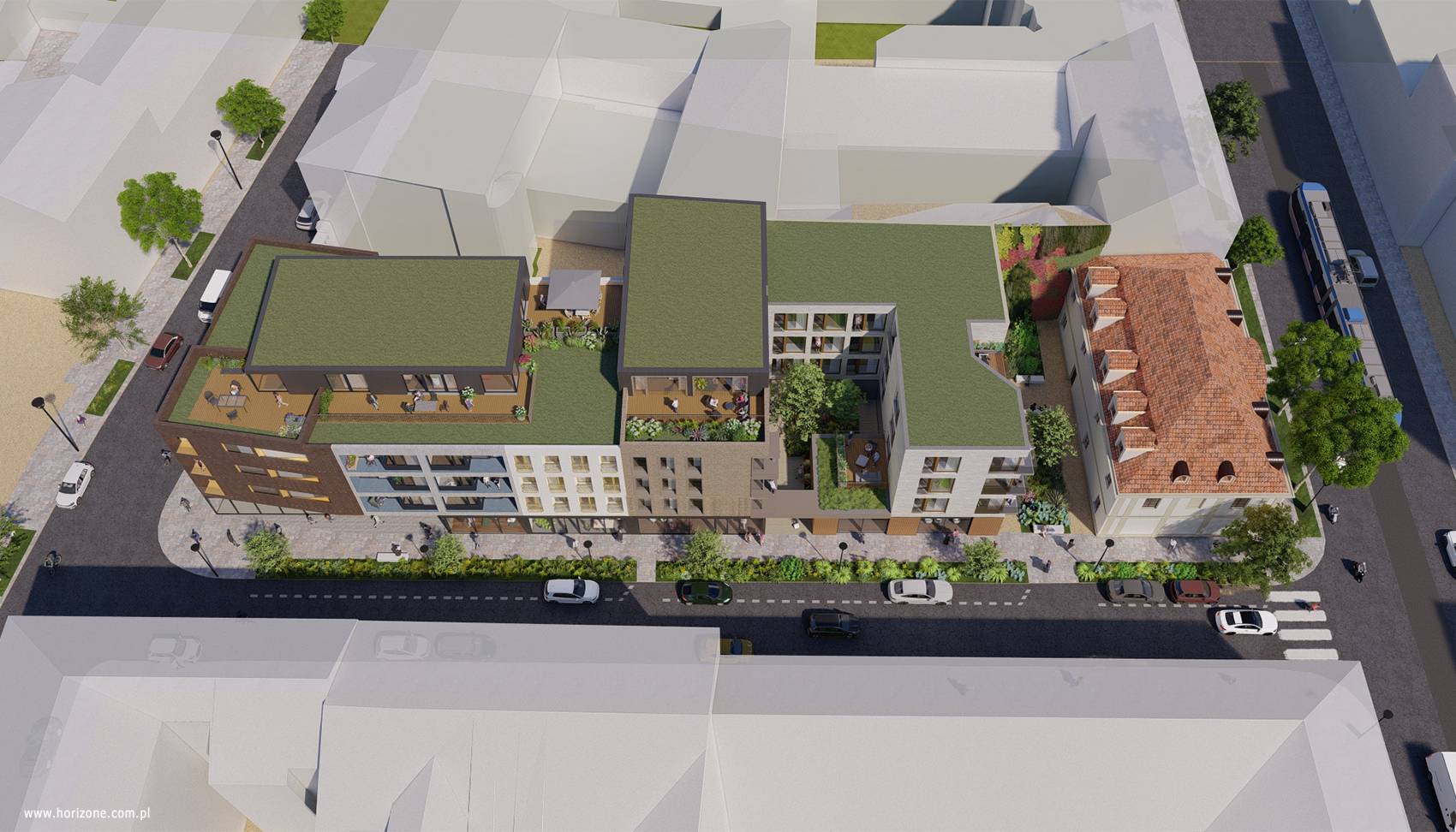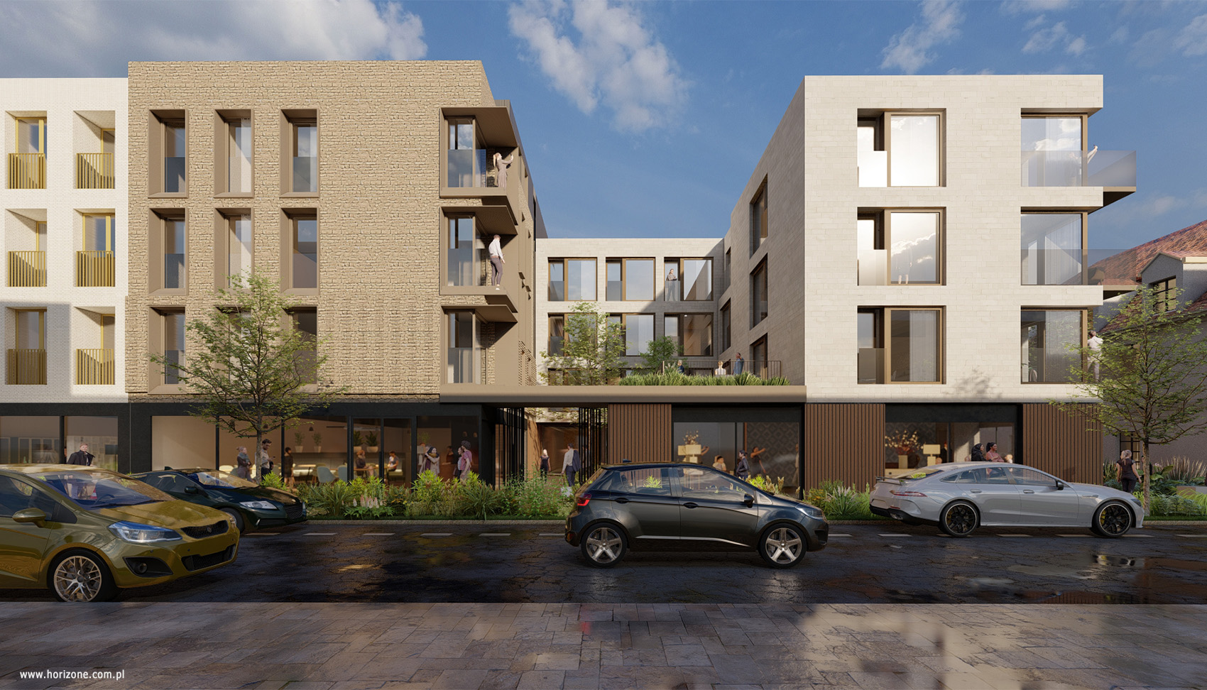 The architecture of the complex emphasizes coherence with the historical urban layout, while introducing modern functional and aesthetic solutions. Thanks to the deformation of the building mass dictated by the shape of the neighboring buildings, the resulting nooks were used, which will provide appropriate lighting for the rooms and prevent the monotony of the development.