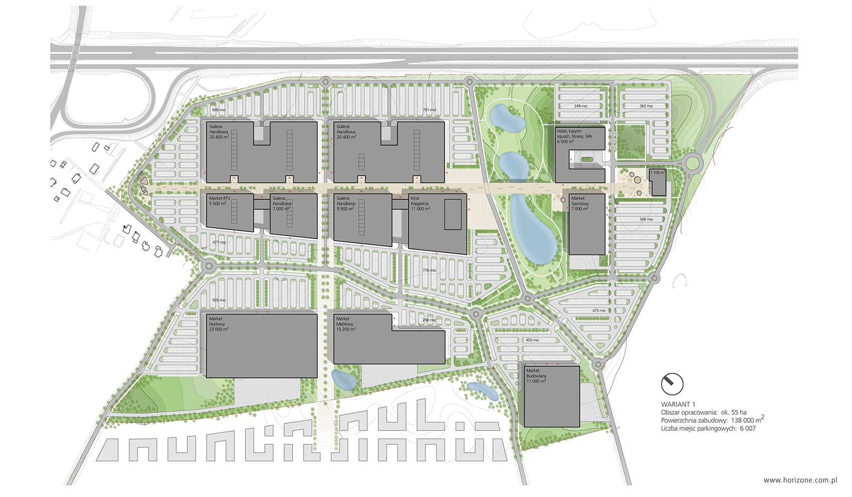 The location of the new retail park with its wide spread green areas, accessibility and functionality takes into account planned, future residential neighbourhood. Its residents will have easy access to services and recreational areas. At the same time retail park will gain new customers. The entire development has a friendly communication system both for drivers, pedestrians, cyclists and delivery.