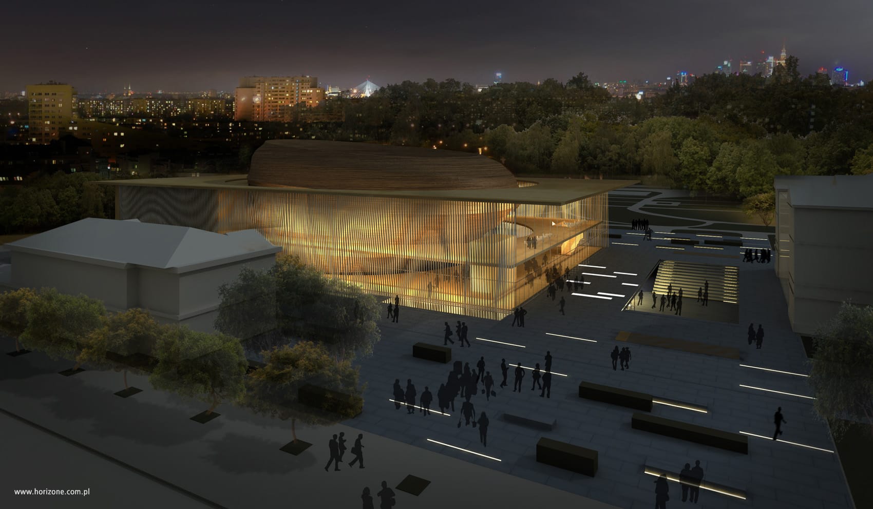 Natural light skillfully penetrating into this space brightens the foyer of the underground floors. The transparent nature of the building’s architecture harmonizes well with the historic buildings. The side elevations are shielded by a subtle form of louvers made of steel tendons, which, set in a jittering rhythm, are a reminiscence of the structure of a sound wave.