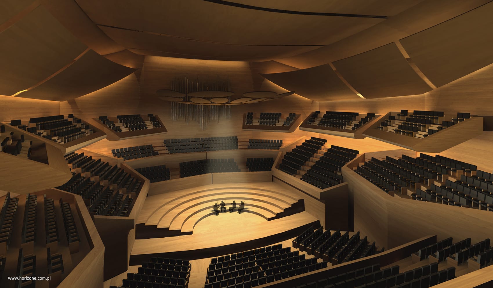 The interior of the main concert hall has been solved as a “vineyard” type premise with a terraced layout and balconies suspended in the space, in a symmetrical arrangement. The acoustic assumption adopted, developed individually for this project by a London-based acoustics consultant, consisting of a system of movable ceiling elements and interacting acoustic screens, allows flexible adaptation of listening conditions to different types of concerts.