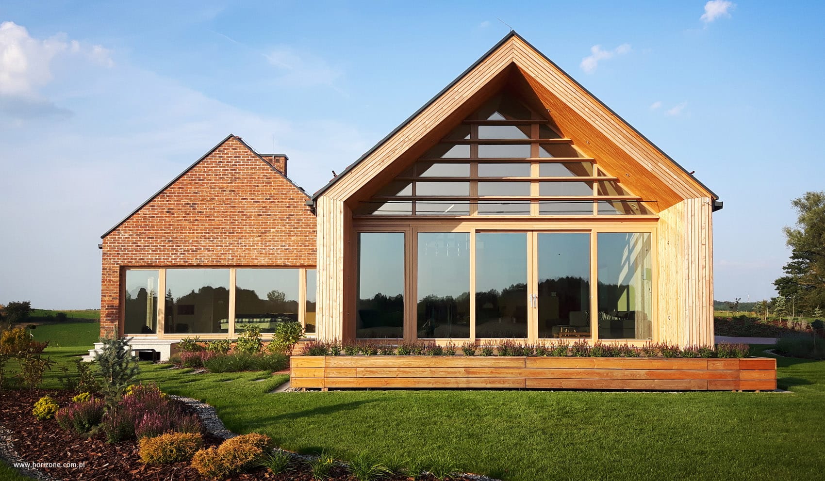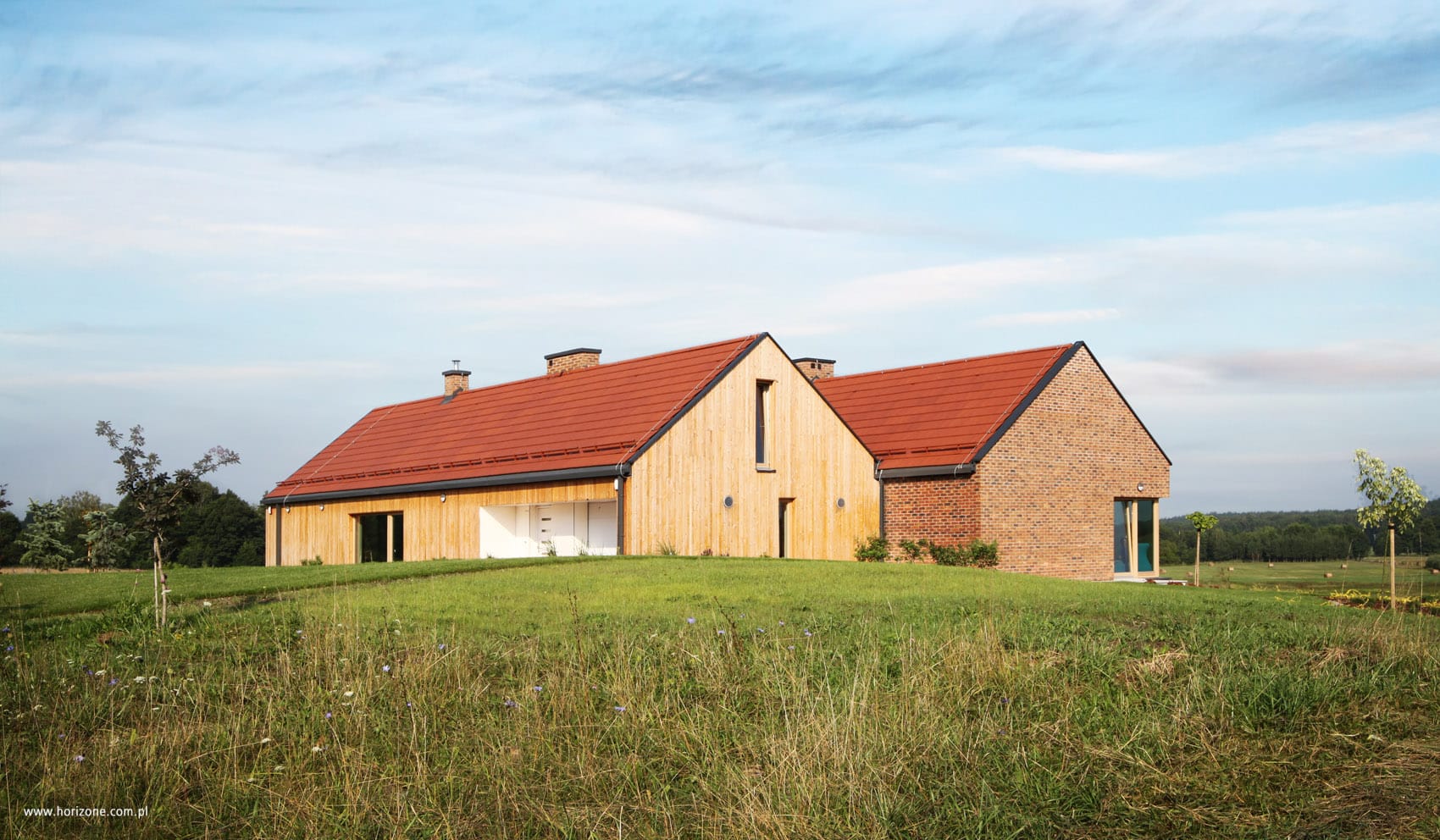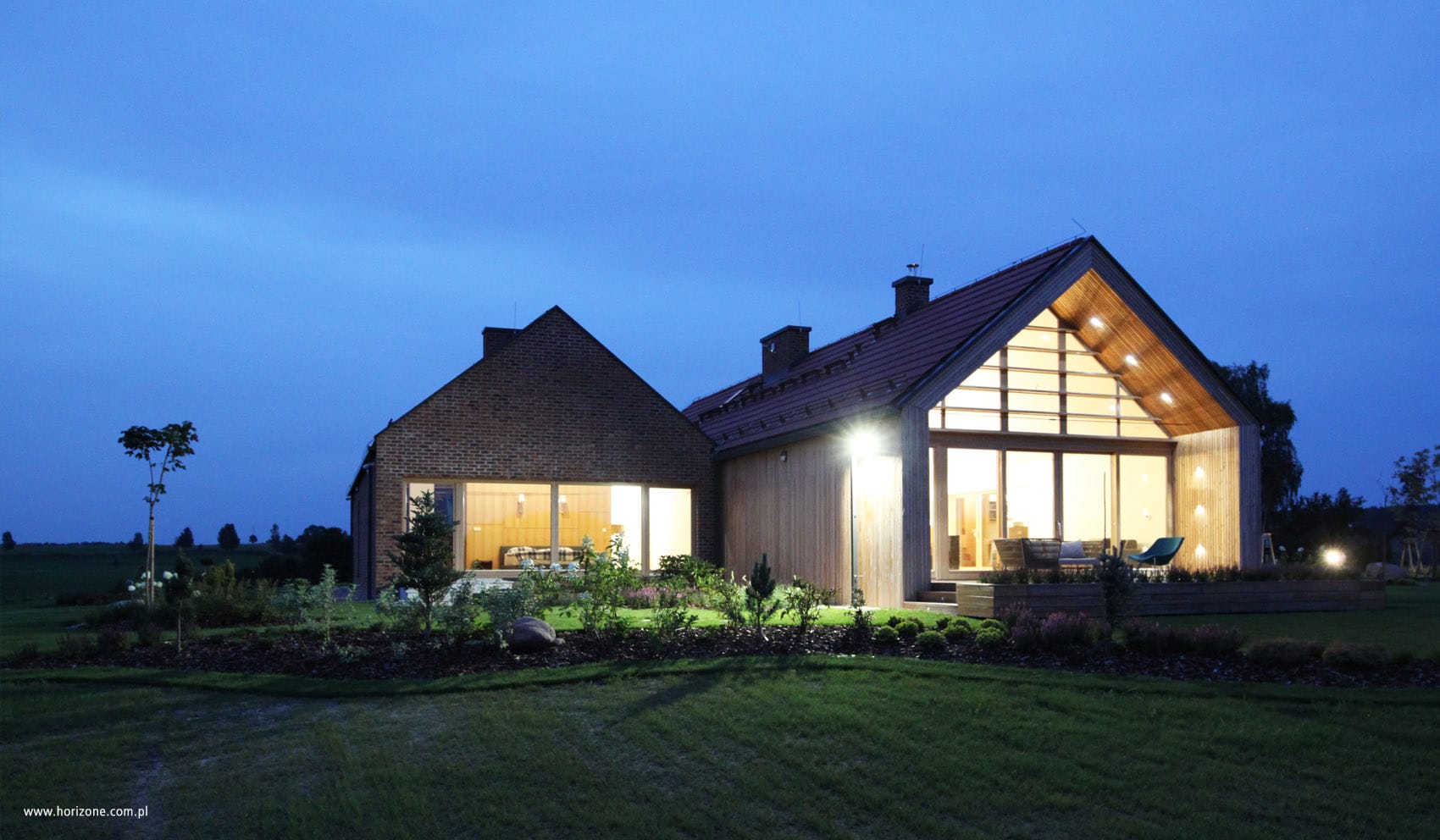 The aim of the project was for the new house to blend in with the landscape of Warmia as much as possible and for its interior to be open to the surroundings. In line with this idea, a simple form of two twin blocks was created, slightly offset from each other, covered with gable roofs. The form of the house refers to a rural farmstead.