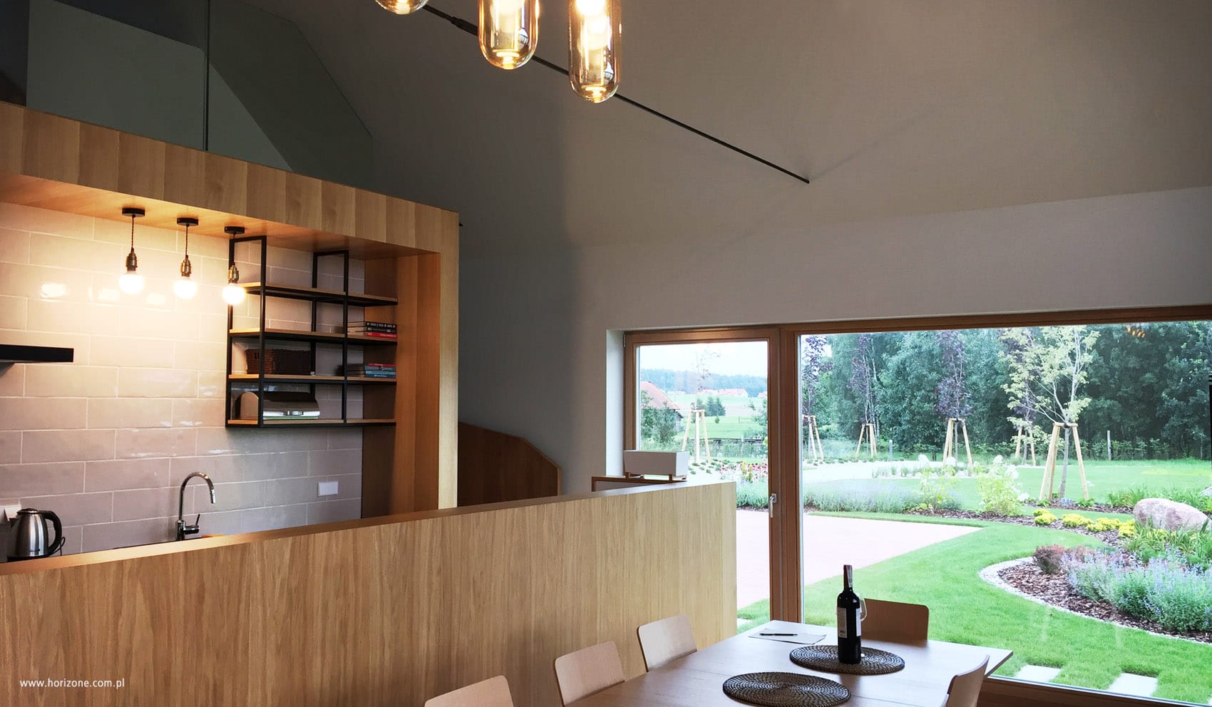 The single-family house in Woryty was built in an open landscape on a slightly undulating glade among the picturesque landscape of Warmia. Meadows covered with wild greenery, ending with the tree-lined shoreline of the Pasłęka River, constituted a demanding and unique context for the designed building.