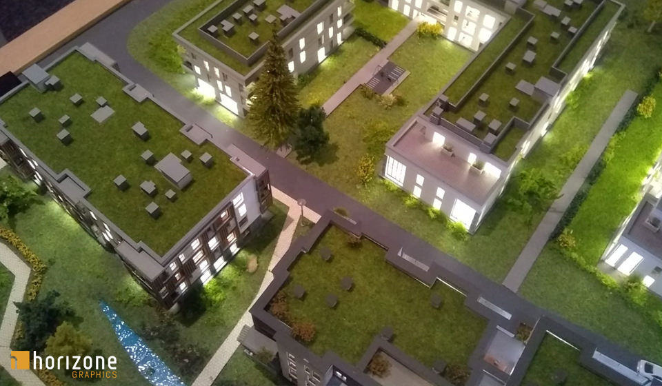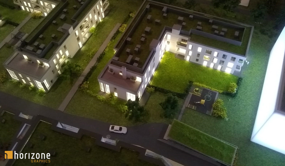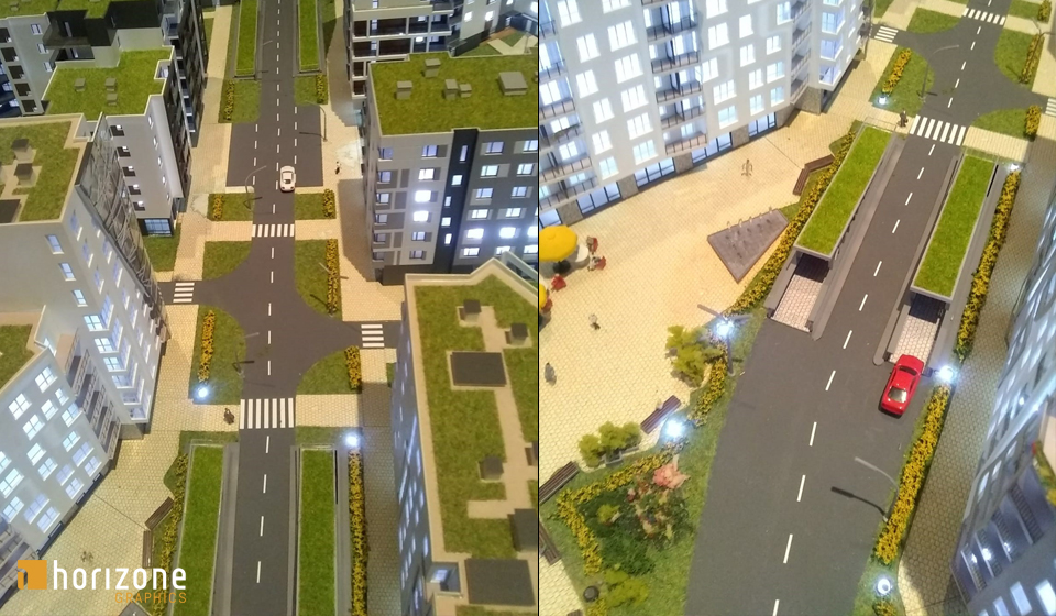Zakres prac obejmował również dodanie placów zabaw, a także korektę wybranych elementów infrastruktury, takich jak wjazdy do garaży oraz fontanna, w celu dostosowania makiety do aktualnych założeń projektowych. Zintegrowane oświetlenie LED podkreśla bryły budynków oraz kluczowe strefy przestrzeni wspólnych, zwiększając czytelność modelu podczas prezentacji.