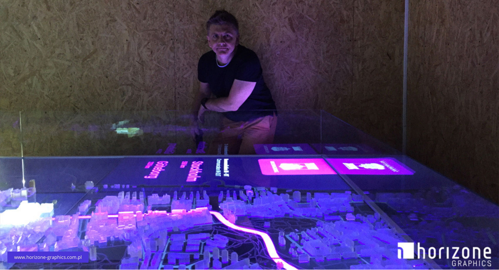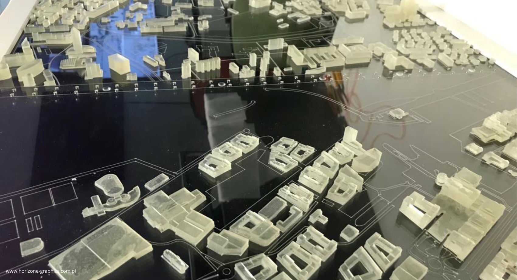 Model powstał w skali 1:1000 i został zrealizowany w technologii mieszanej, łączącej druk 3D z elementami fizycznymi oraz multimedialnymi. Kluczowym komponentem projektu jest ekran LED o wymiarach 2 × 4 m, który umożliwia dynamiczne prezentacje – od wizualizacji urbanistycznych po narracje o rozwoju miasta. Dzięki temu makieta nie tylko przedstawia przestrzeń, ale również opowiada historię i pokazuje procesy zachodzące w mieście.