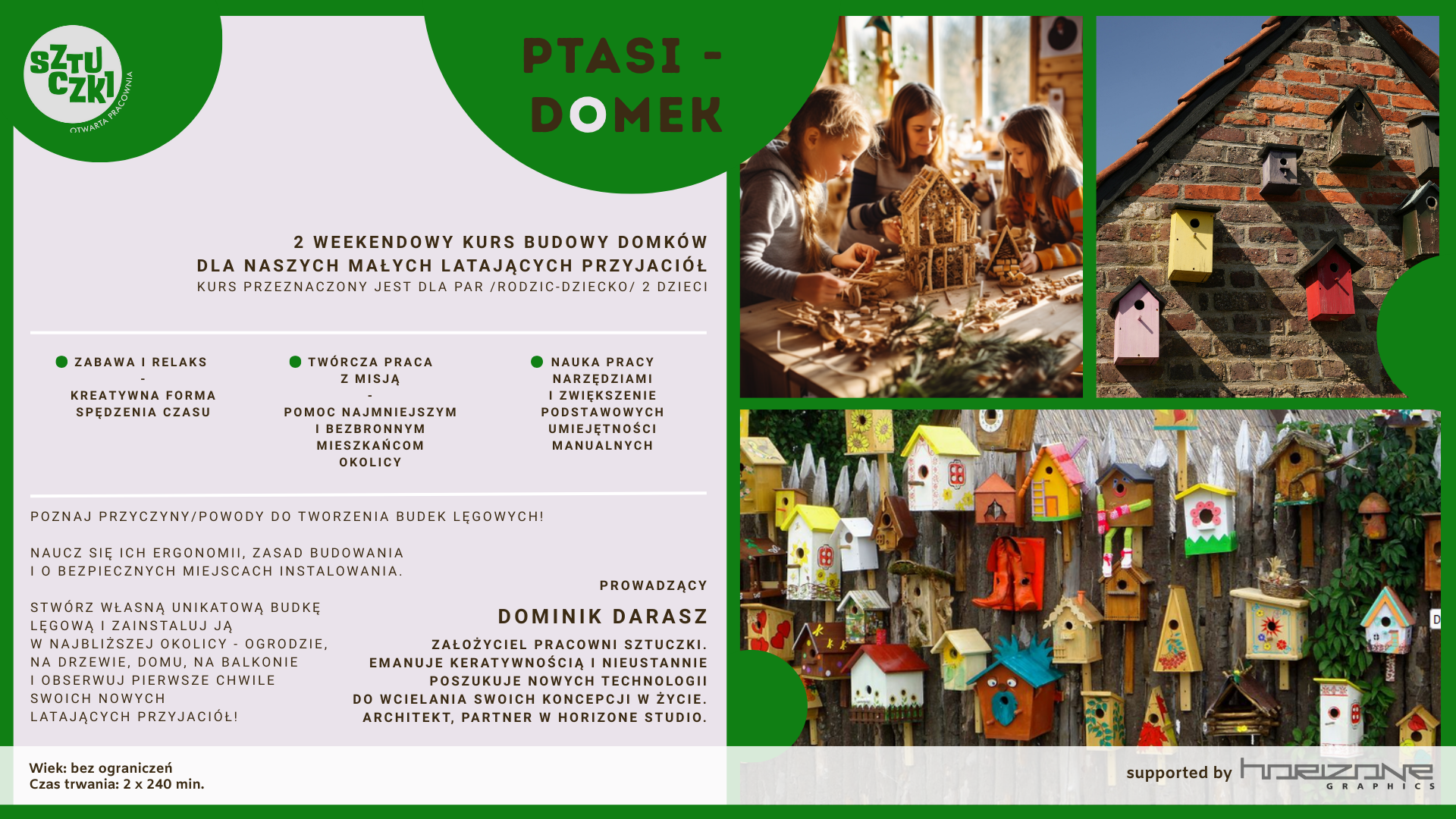 2 weekendowy kurs budowy domków dla naszych małych latających przyjaciół. Kurs przeznaczony jest dla par /rodzic-dziecko/ 2 dzieci